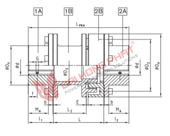 | DH | DF | D2 | D3 | l1, l2 | b | MA | E | L | LPKA | LZ | t | TA [Nm] | |||||